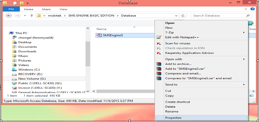 Right click on “SMSEngine5.mdb” then click properties.