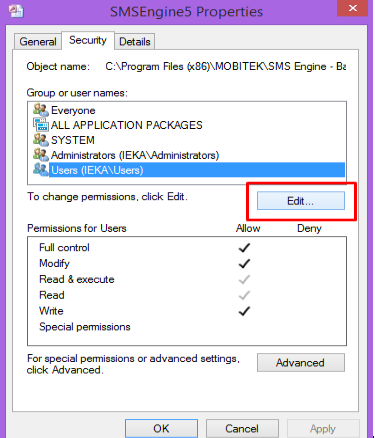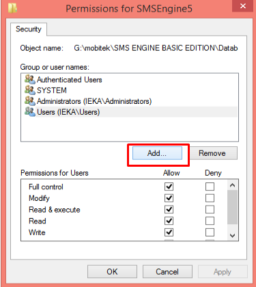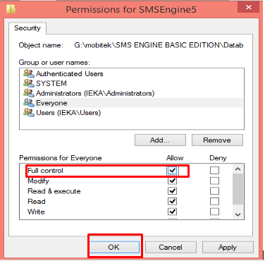 3. Allow “Full control” to “Everyone” for the database file,  “SMSEngine5.mdb”.