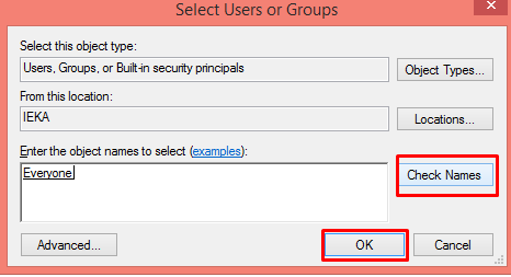 Type “Everyone”, Click at Check Names and then click “OK”.