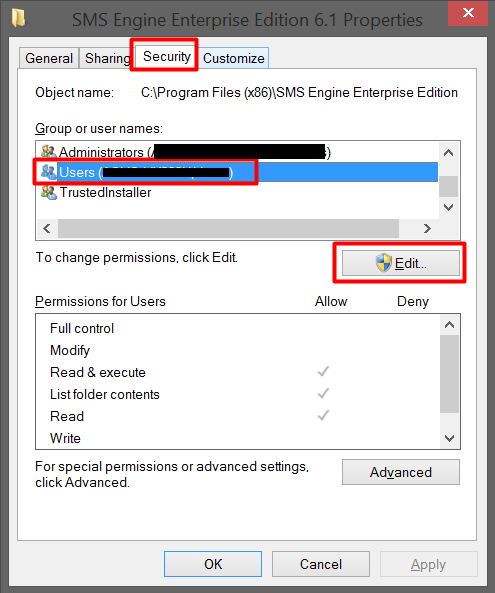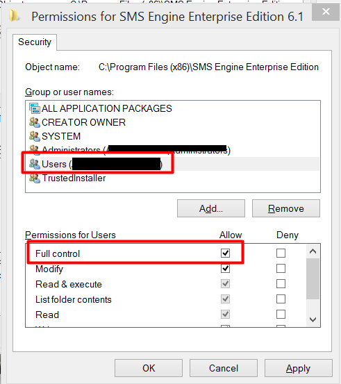 Allow “Full Control” to “Users” to the folder of the application. In this example, itis “C:\Program Files (x86)\SMS Engine Enterprise Edition”