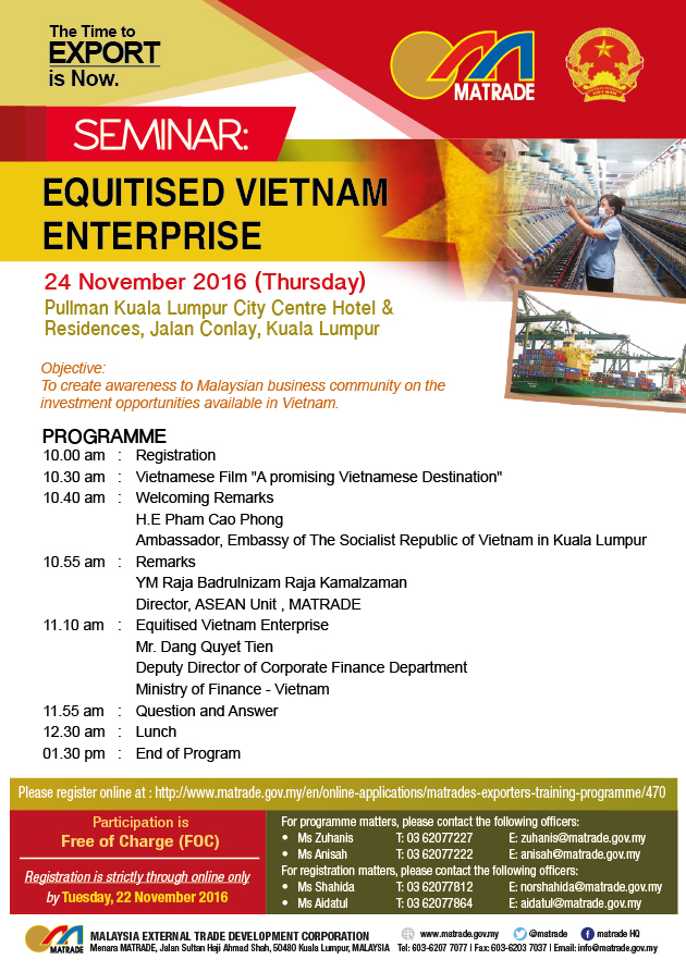 2. MATRADE and Vietnam Embassy is inviting Malaysian companies to attend this programme. This seminar is free of charge (FOC). Please register thru online at MATRADE website: http://www.matrade.gov.my/en/online-applications/matrades-exporters-training-programme/470. The closing date for registration is on 22 November 2016. For more information on registration please contact Ms Norshahida Othman at 03-62077812 or e-mail: norshahida@matrade.gov.my, or Aidatul Marina at 03 62077864 or email: aidatul@matrade.gov.my. For programme please contact Ms Zuhanis at 03 62077227 or email: zuhanis@matrade.gov.my, or Ms Anisah at 03 62077222 or email: anisah@matrade.gov.my,