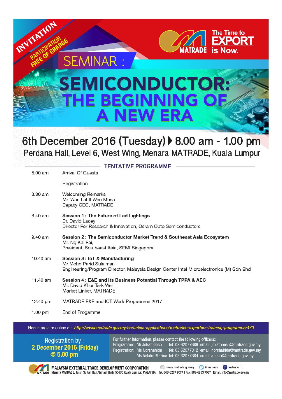 Malaysia External Trade Development Corporation (MATRADE) will organise a seminar entitled Semiconductor: The Beginning of a New Era as follows: