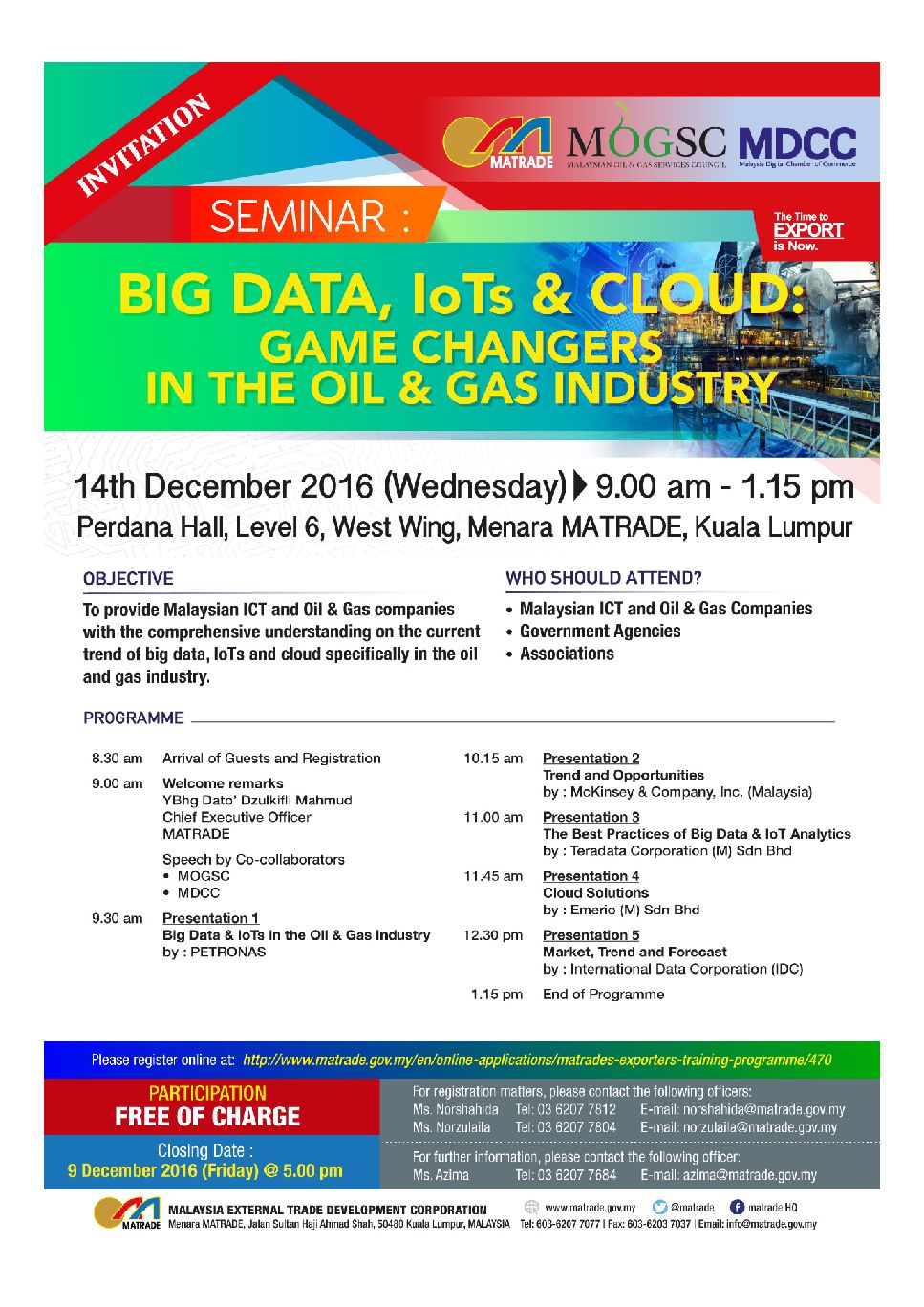 Malaysia External Trade Development Corporation (MATRADE), in collaboration with the Malaysian Oil & Gas Services Council (MOGSC) and Malaysia Digital Chamber of Commerce (MDCC) will be organizing a Seminar on “Big Data, IoTs & Cloud : Game Changers in the Oil & Gas Industry” as follows: