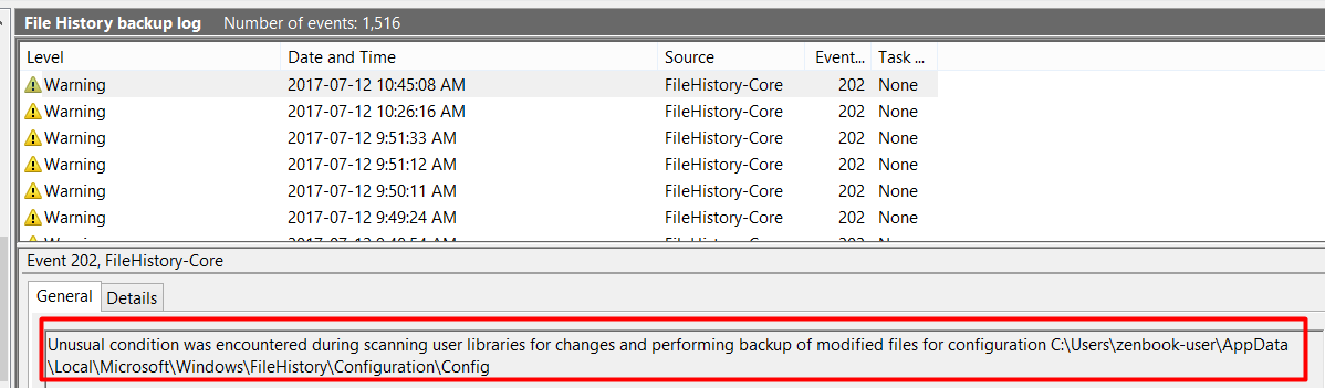 Unusual condition was encountered during scanning user libraries for changes and File History not running on schedule