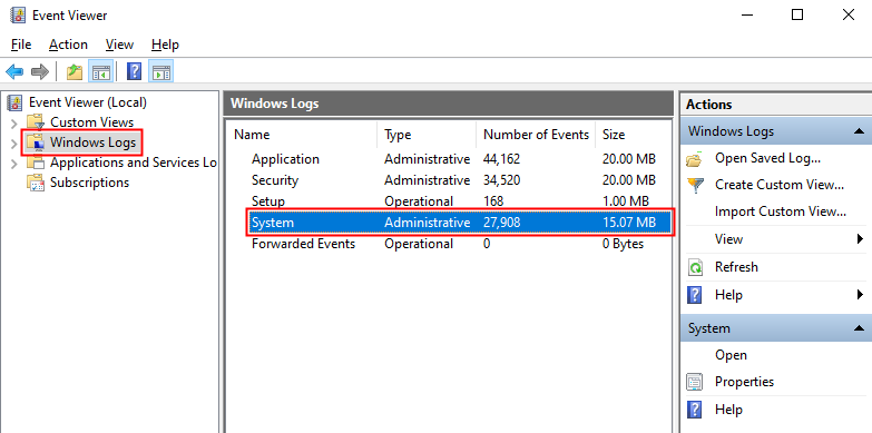 2. Event Viewer window will open. Now on the left side of that window click on  “Windows Logs”. Now on the right side, click on System.
