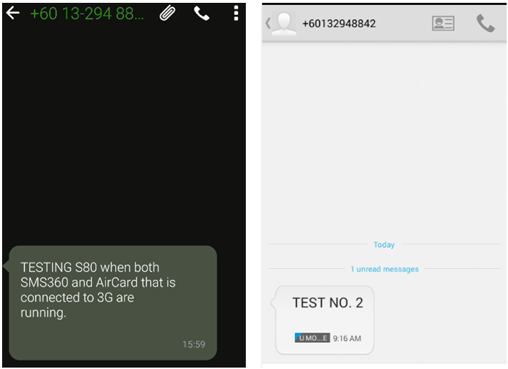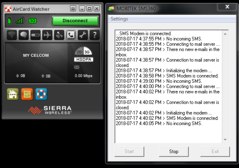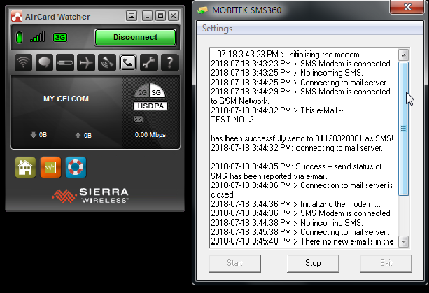 Result: MOBITEK SMS360 E-MAIL is working, able to convert e-mail to outgoing SMS. Both AirCard Watcher and MOBITEK SMS360-Email were able to run at the same time.
