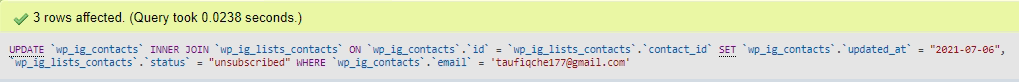 • 2 records in table “wp_ig_lists_contacts” will be updated with `status` = "unsubscribed"