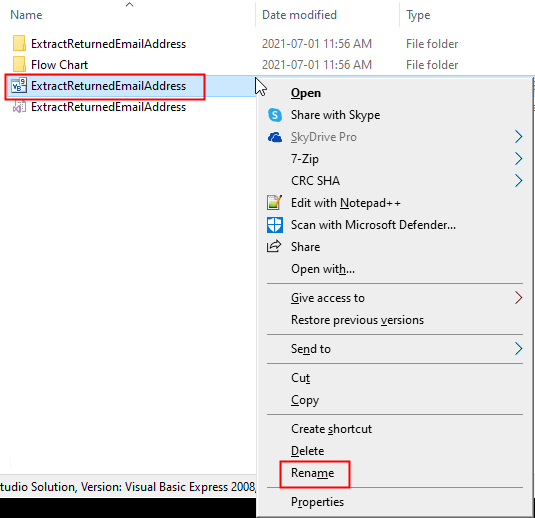 2. In Windows Explorer, right-click on project’s Main solution (.sln) → “Rename”.