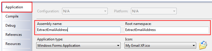 4. In “Solution Explorer”, right-click on project → “Properties” → goto “Application” tab, rename “Assembly name” and “Default namespace” to match the project’s name.