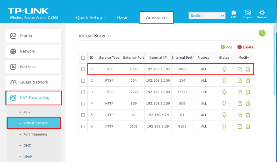 Open admin panel (192.168.1.1). Go to “Advanced” -> “NAT Forwarding” -> “Virtual Servers”, add: