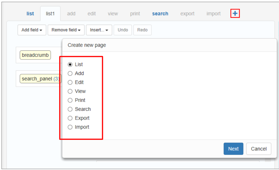 - Inline Add – Visible when the List page allows inline adding. This button opens an inline adding interface