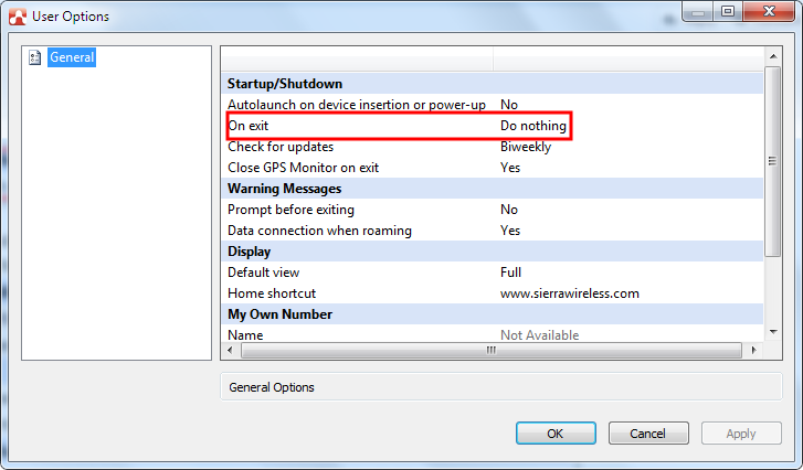 - To prevent MOBITEK S80 from shutting down when exiting AirCard Watcher, set to “Do nothing”.