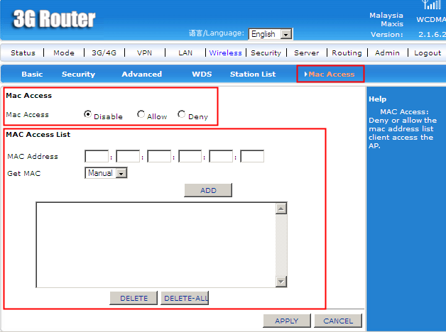 Mac Access can set either to disable, allow, or deny. If allow or deny is choose, enter the mac address on the MAC Access list to allow or deny that mac address of client to access the AP.