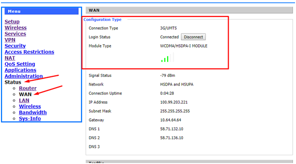 5. Click on “WAN”, to check 3G signal strength and connection status.