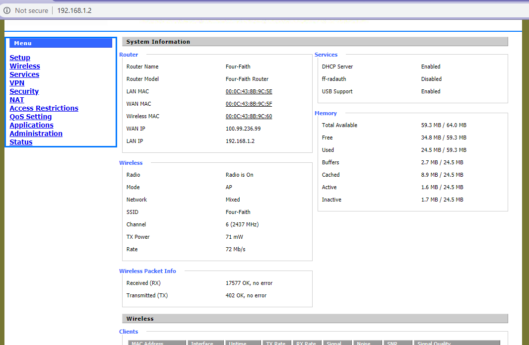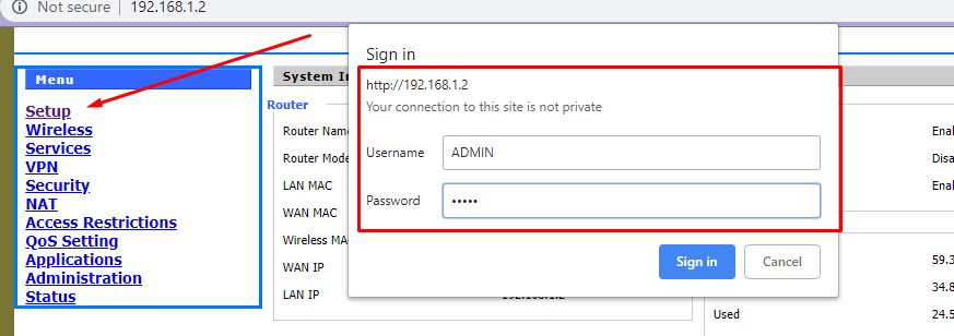 4. Click on “Setup”, and enter this to enable access to the Configuration Page of F342x —  user name “admin”, password  is “admin”.