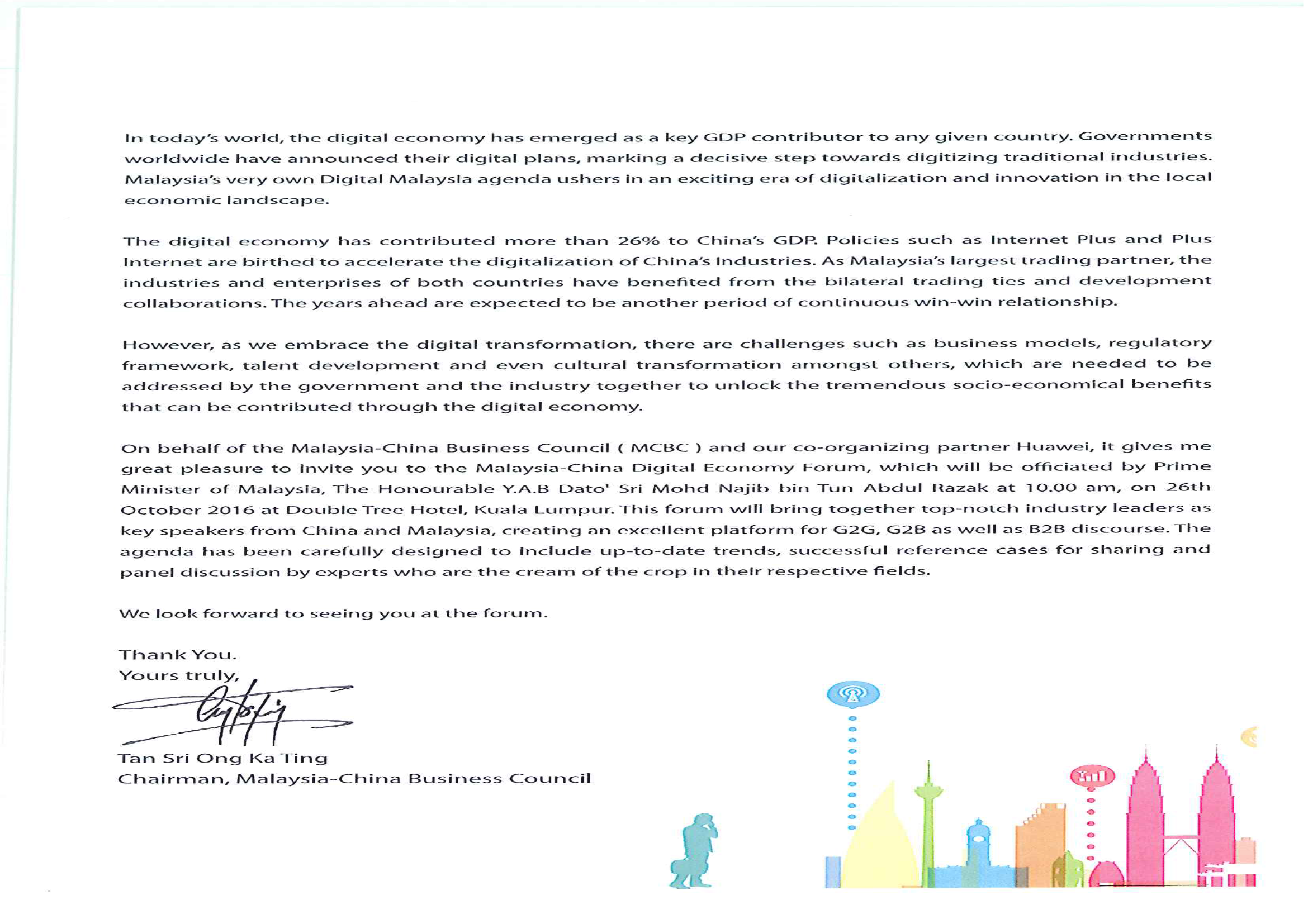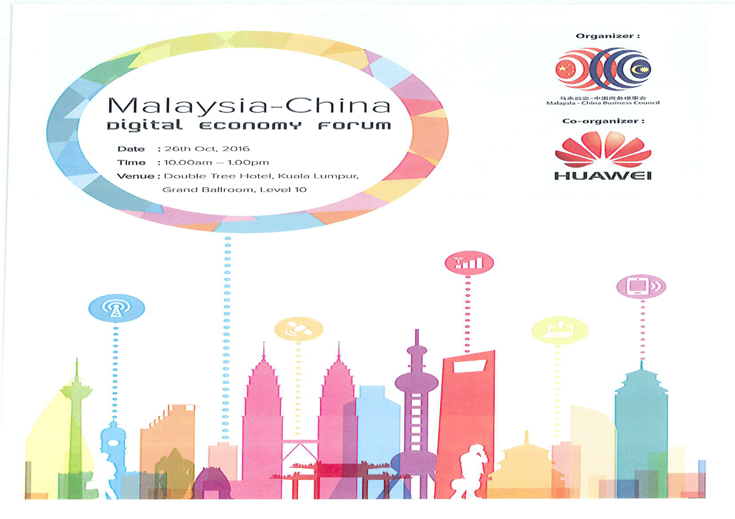 Kindly be informed that Malaysia-China Business Council will be organising the Malaysia-China Digital Economy Forum with Huawei as the co-organiser of the event. Our Prime Minister, Y.A.B. Dato’ Sri Mohd. Najib bin Tun Haji Abdul Razak will be officiating the Opening Ceremony.