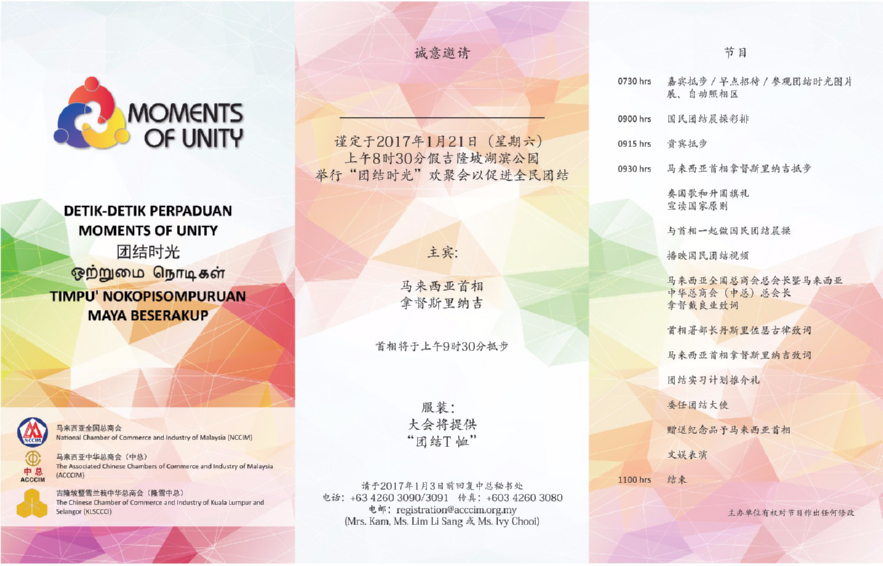 We are pleased inform that the National Chamber of Commerce and Industry of Malaysia (NCCIM), the Associated Chinese Chambers of Commerce and Industry of Malaysia (ACCCIM) and the Chinese Chamber of Commerce and Industry of Kuala Lumpur and Selangor (KLSCCCI) will jointly organise the “Moments of Unity” Happy Gathering on 21st January 2017, 8.30 a.m. at Canopy, Lake Garden, Kuala Lumpur. Details of the event are as follows: