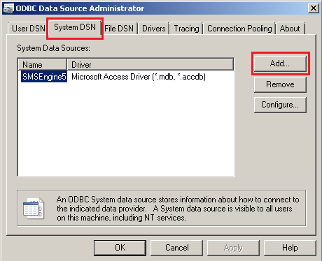 - Select “System DSN” tab. Click “Add”.