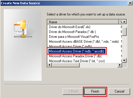 - In this example, we are connecting to MS Access database, in “Create New Data Source”, select “Microsoft Access Driver (*.mdb, *.accdb)” in the list. Click “Finish”.