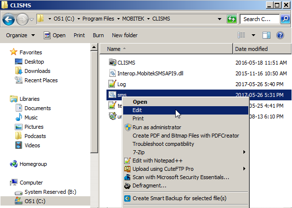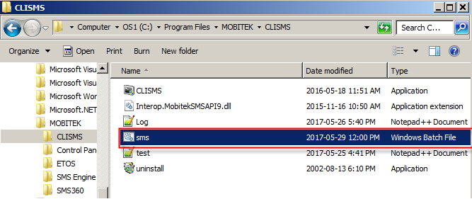 - Go back to your path file C:/Program Files/Mobitek/CLISMS. Double click at sms.bat