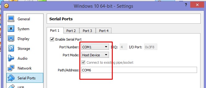 Note: Windows provides legacy names only for COM ports 1 through to 9. For all other COM ports you must use the full device naming convention under Windows. So if you decide to use COM10 instead of COM9, using COM10 at Path/Address won’t work. Instead you have to use “\\.\COM10”. (source: https://stackoverflow.com/questions/37728628/connection-through-com-port-between-host-and-guest-in-virtualbox)