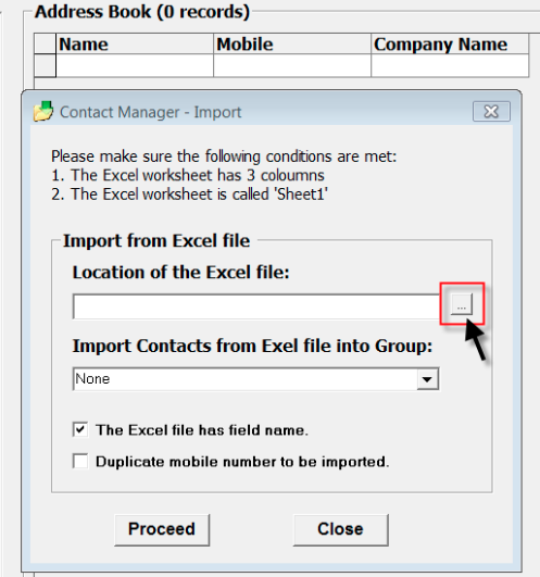 - Once, the contact manager tab appear click the browse button to search for the excel file and select it.